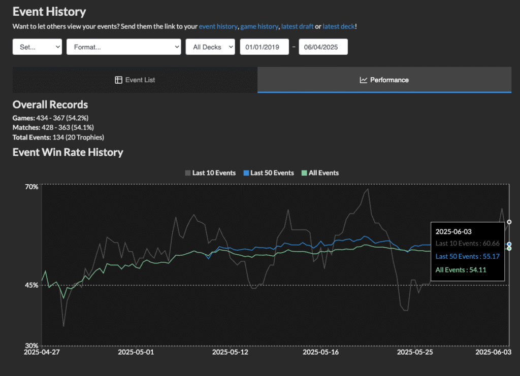 After the Arena Open, I plummeted to a mere 38% win percentage and started to doubt myself. A combination of lack of sleep and focus and mindlessly drafting “to win some more” caused a pretty rough decline.