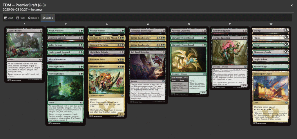 Most of my trophies in Tarkir Dragonstorm I have won with Temur, Boros / Mardu, and Jeskai. The occasional Simic trophy deck was also in my list but Abzan was never 7-x.